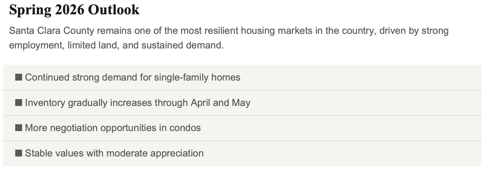 The Santa Clara County housing market is stepping into the spring selling season with strong buyer demand, gradually rising inventory, and continued price strength, especially for single-family homes. Well-priced homes are selling quickly and often above asking price.